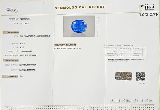 Certified Blue Sapphire-3.30 Carats (3.63Ratti) Sri Lanka (Ceylon), SKU:BCZI57