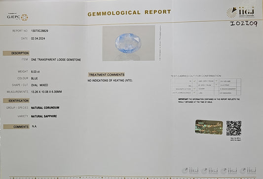 Certified Blue Sapphire-8.03 Carats (8.83 Ratti) Sri Lanka (Ceylon), SKU:IOZI09