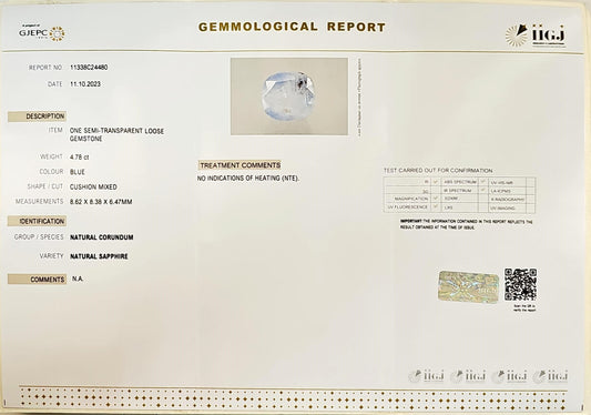 Certified Blue Sapphire-4.78 Carats (5.26 Ratti) Sri Lanka (Ceylon), SKU:JFZI12