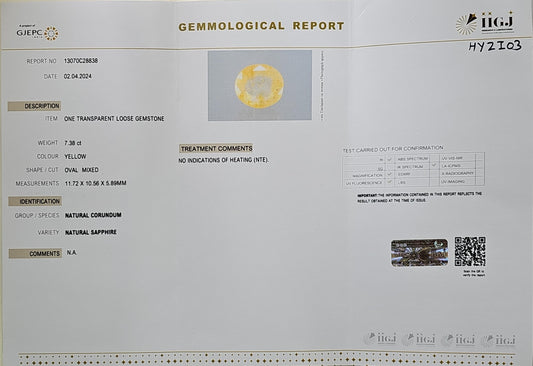 Certified Yellow Sapphire-7.38 Carats (8.11 Ratti) Sri Lanka (Ceylon), SKU: HYZI03