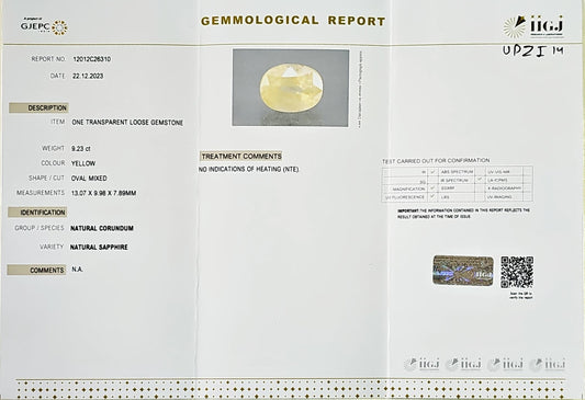 Certified Yellow Sapphire-9.23Carats (10.15 Ratti) Sri Lanka (Ceylon), SKU:UPZI14