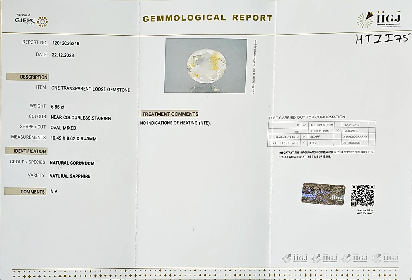 Certified White Sapphire-5.85 Carats (6.45 Ratti) Sri Lanka (Ceylon), SKU:HTZI75